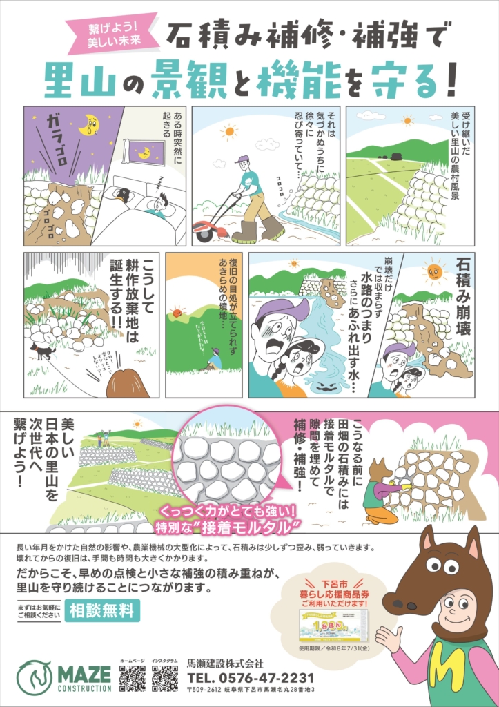 馬瀬建設株式会社では、石積みの補修・補強を通じて、里山の景観と機能を守る取り組みを行っています。